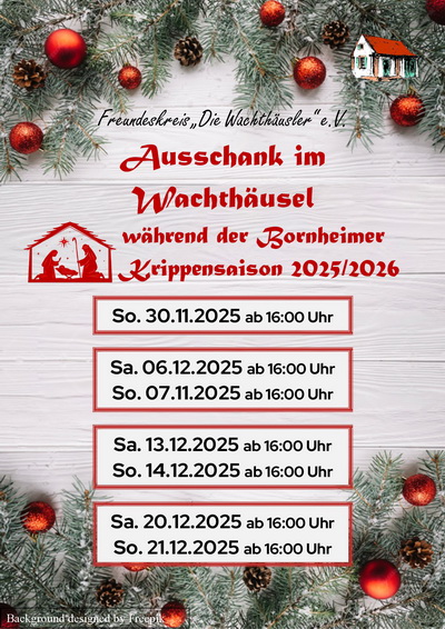 Wir öffnen das Bornheimer Wachthäusel an den verschiedenen Tagen während der Krippensaison vom 30.11.2025 bis 6.1.2026 zur Bewirtung der Besucher ... (... hier weiterlesen)